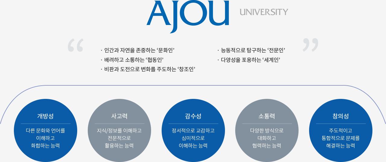 실사구시 | 비판과 도전으로 변화를 주도하는 창조인 | 창의성 | 주도적이고 통합적으로 문제를 해결하는 능력 |