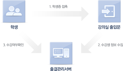 학생 -> 1. 학생증 접촉 -> 강의실 출입문 -> 2. 수강생정보 수집 -> 출결관리서버