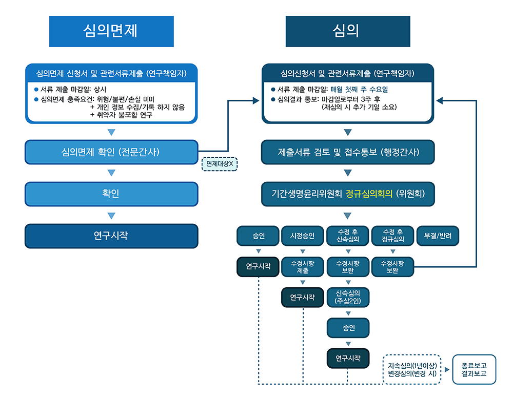 - 승인 - 연구시작 - 지속심의(1년이상), 변경심의(변경 시) - 종료보고, 결과보고