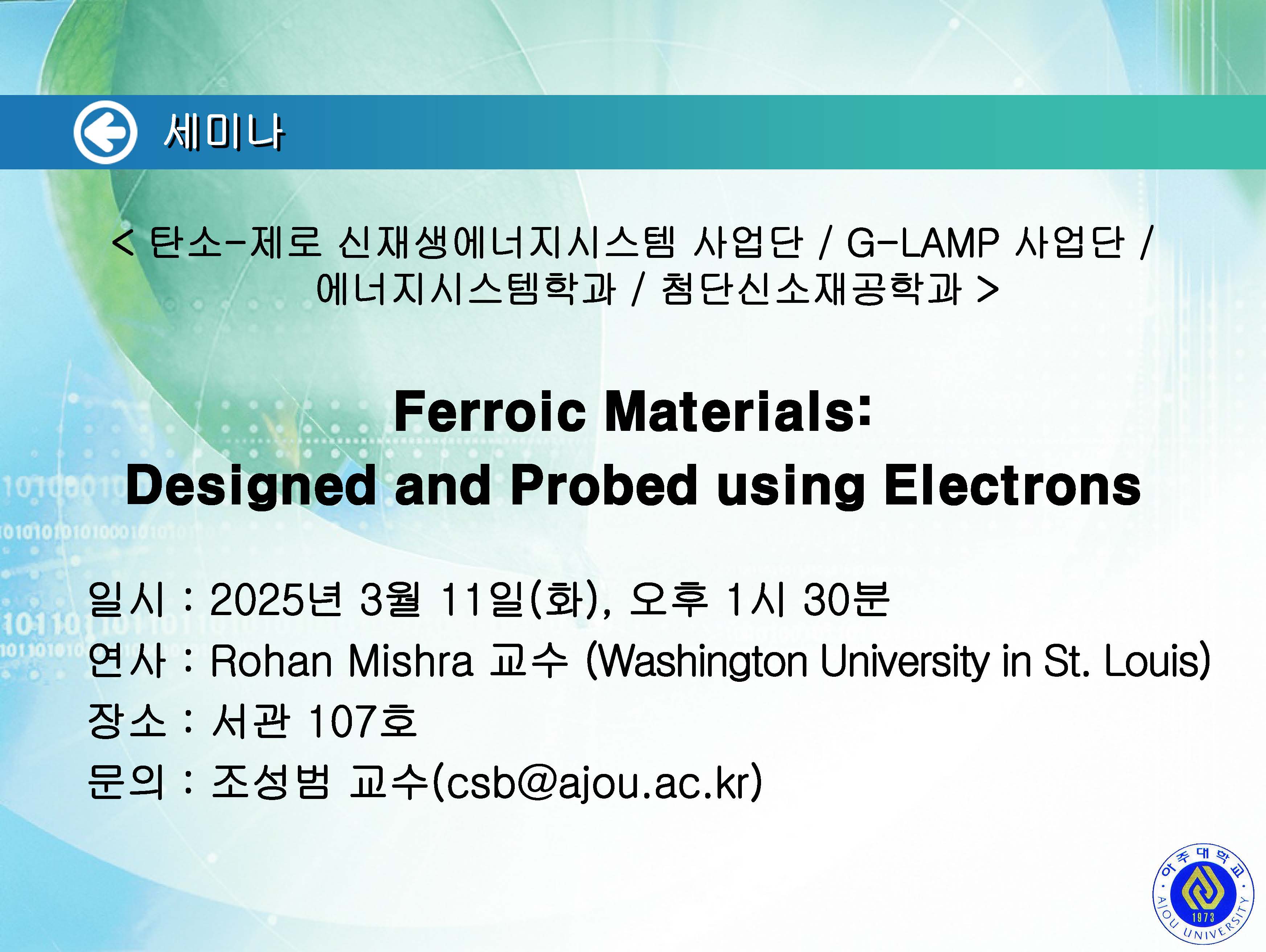 [2025.03.12.수] < 화학과 / G-램프(LAMP)사업단 / 탄소-제로 신재생에너지시스템사업단 / 기초과학연구소 > 세미나 안내