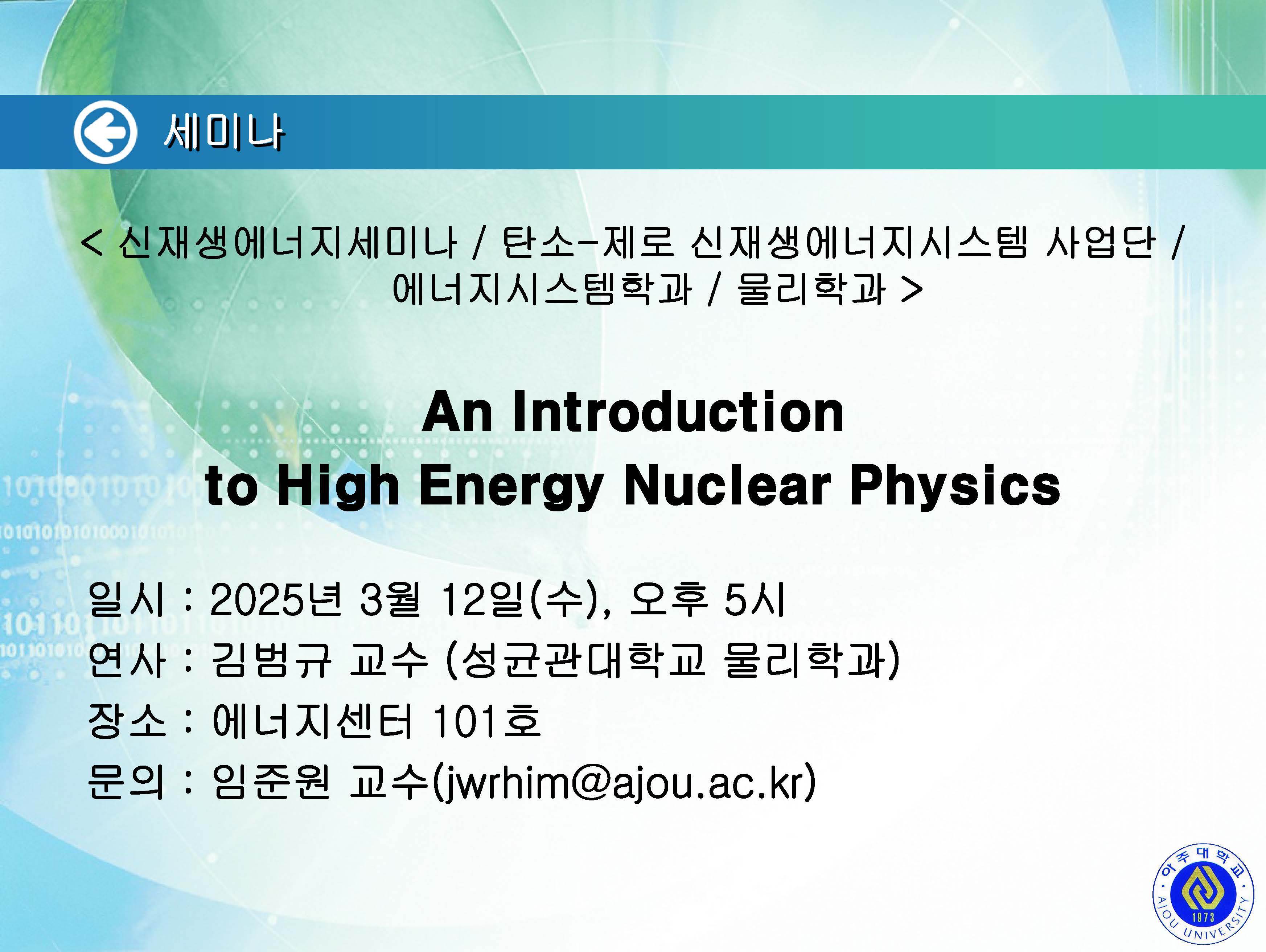 [2025.03.12.수] <신재생에너지세미나 / 탄소-제로 신재생에너지시스템 사업단 / 에너지시스템학과 / 물리학과> 세미나 개최 안내