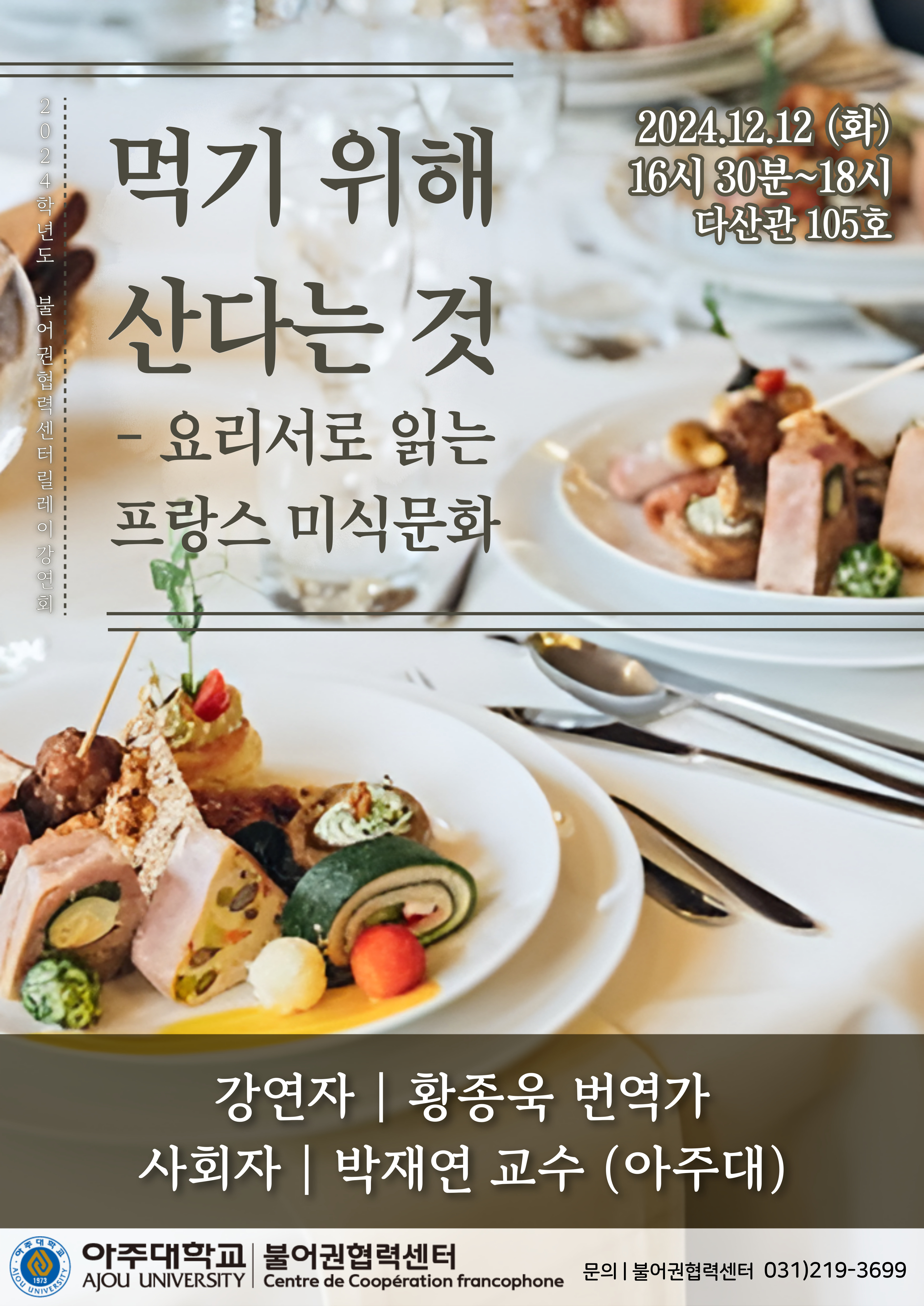[2024.12.10(화)]불어권협력센터 릴레이세미나「먹기 위해 산다는 것 - 요리서로 읽는 프랑스 미식 문화」안내(16:30~18:00)