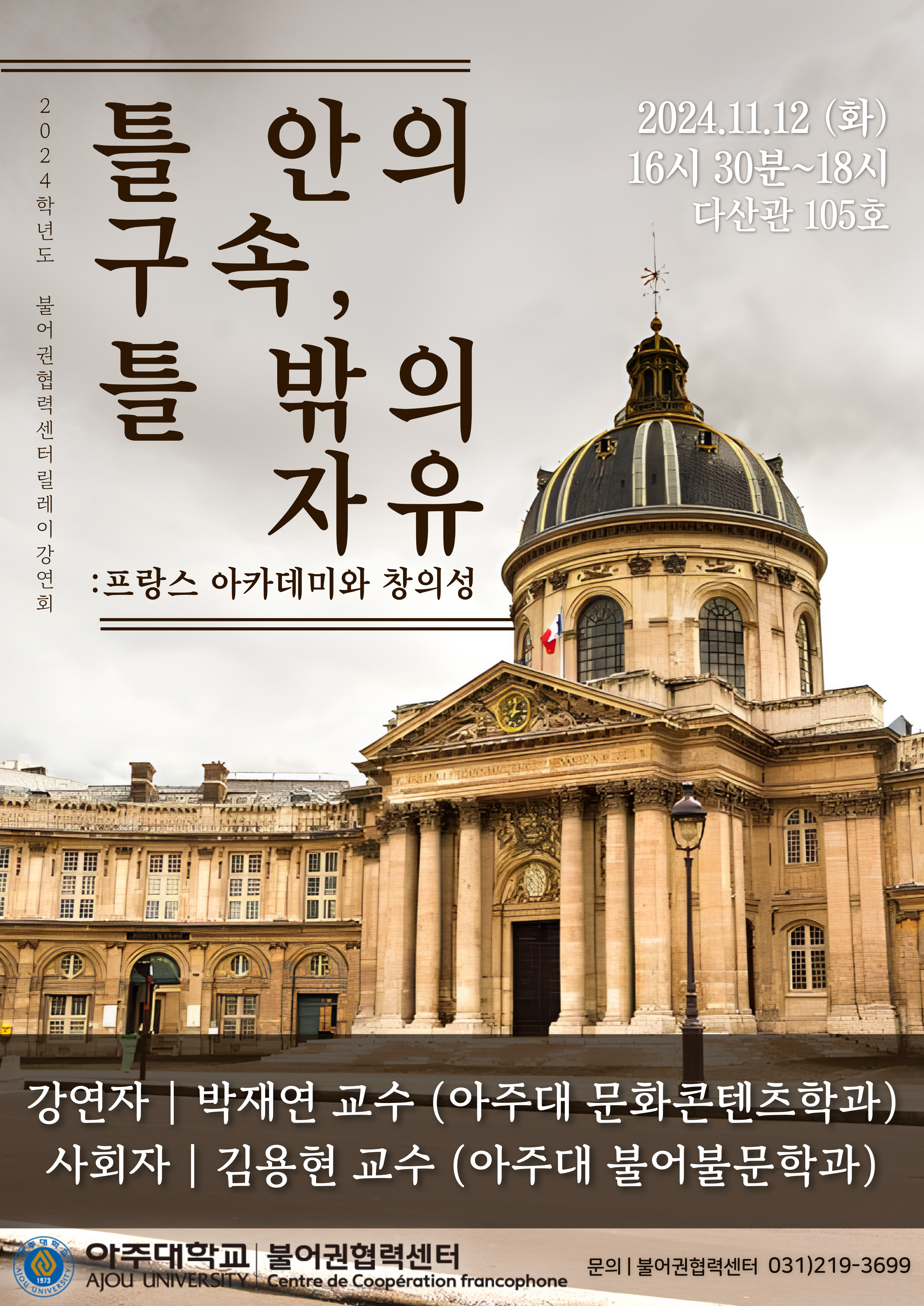 [2024.11.12(화)]불어권협력센터 릴레이세미나「틀 안의 구속, 틀 밖의 자유: 프랑스 아카데미와 창의성」안내(16:30~18:00)