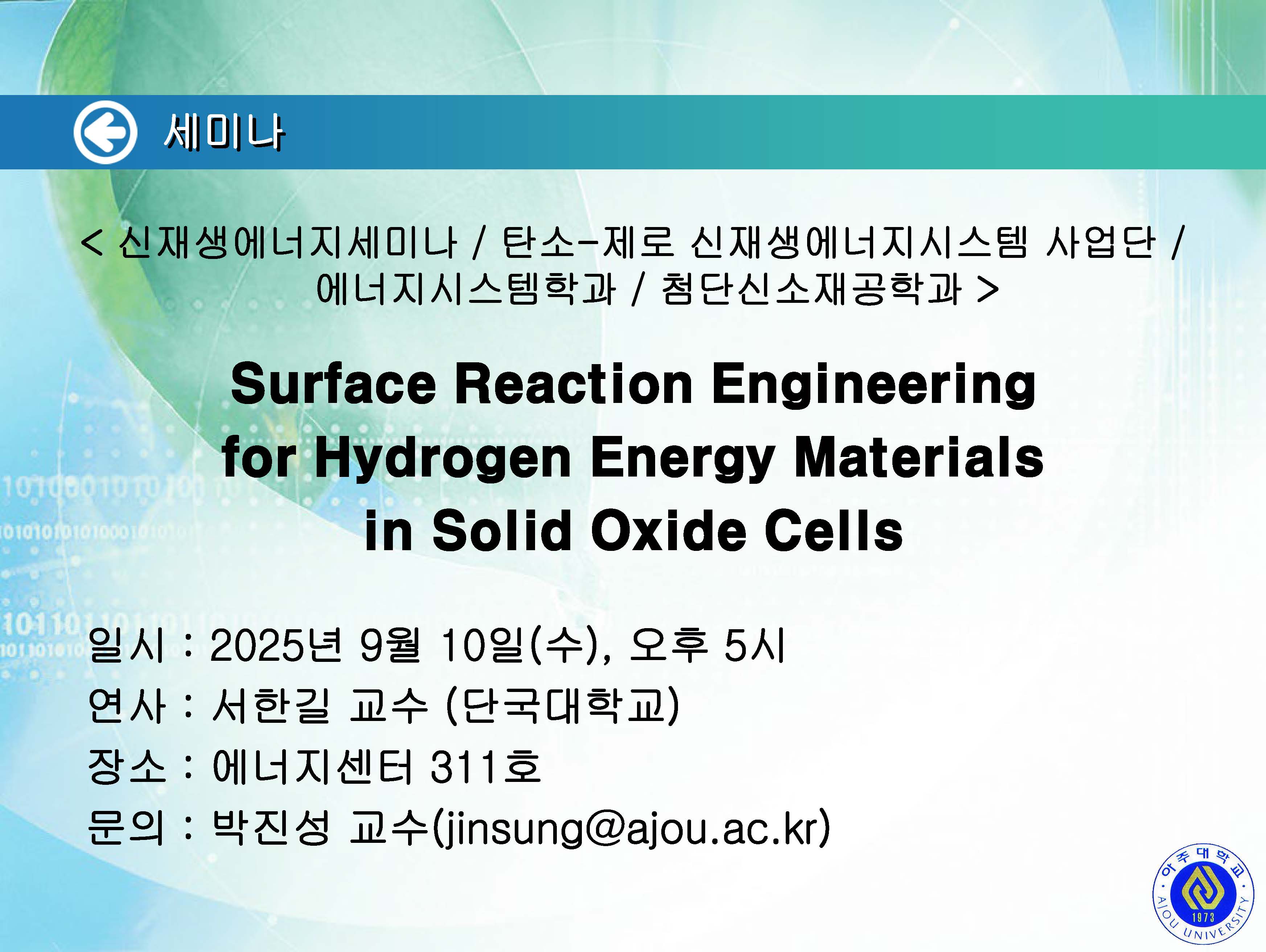 [2025.09.10.수] <신재생에너지세미나 / 탄소-제로 신재생에너지시스템 사업단 / 에너지시스템학과 / 첨단신소재공학과> 세미나 안내