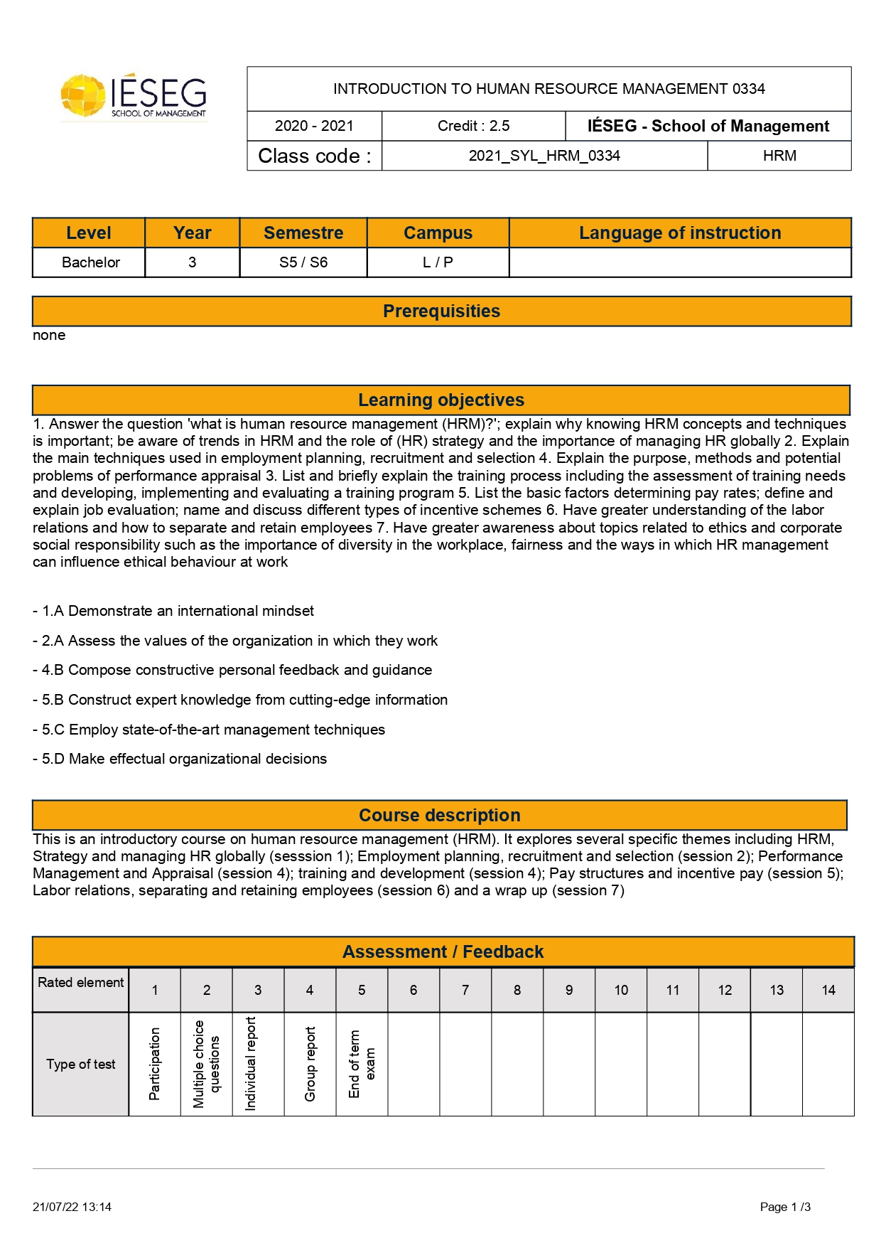 과목별 Syllabus는 과목의 학점, 이수 시간이 정확히 기재되어 있어야 합니다.