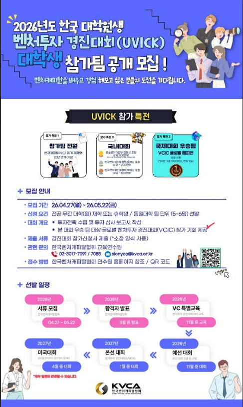 [한국벤처캐피탈협회] 2026년도 '한국 대학(원)생 벤처투자 경진대회 (UVICK)' 참가팀 모집 (~5/22)